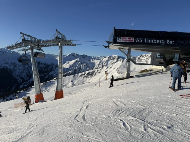 From the top of I2, we aimed for run 168, the direct ski connection to ZellamseeXpress. But with lower natural snow and its south-facing exposure, it was temporarily closed. No problem. Frequent ski buses now run from the base of I1 to ZellamseeXpress, a smooth workaround that kept the journey continuous.