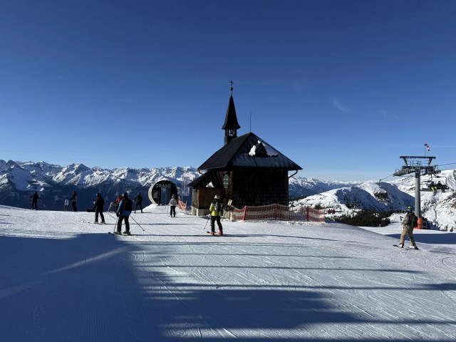 A scenic church seen while skiing at Skicircus Saalbach. | Image: Brett Ploss