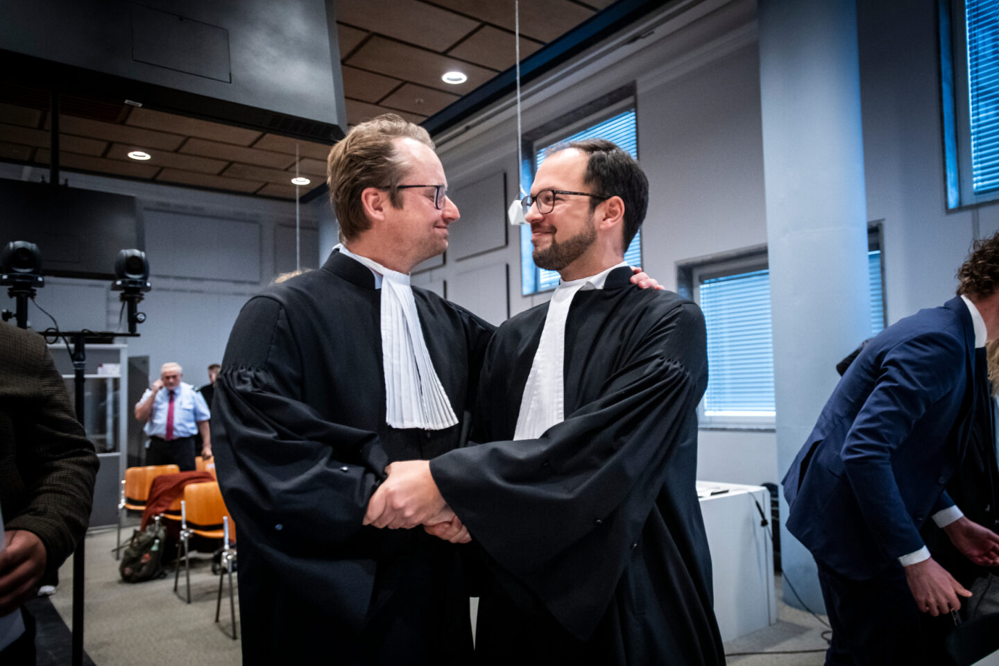 Lawyers Michael Bacon and Emiel Jurjens embrace at the District Court of The Hague (Photo: Marten van Dijl / Greenpeace)