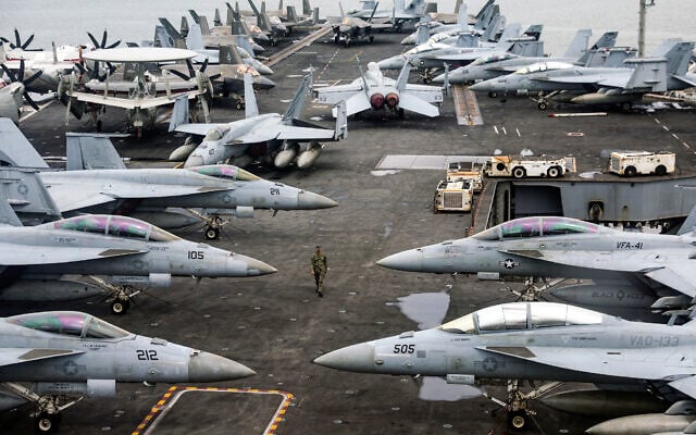 A US Navy officer walks past fighter jets sitting on the flight deck of the Nimitz-class aircraft carrier USS Abraham Lincoln, during a media tour in Port Klang, on the outskirts of Kuala Lumpur, on November 26, 2024. (Fazry Ismail/Pool/AFP)