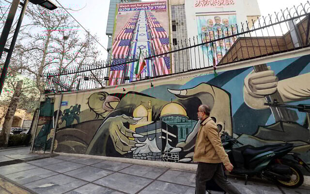 An Iranian man walks past an anti-US and anti-Israel banner hanging on a building in Palestine Square in Tehran on January 27, 2026. (ATTA KENARE / AFP)