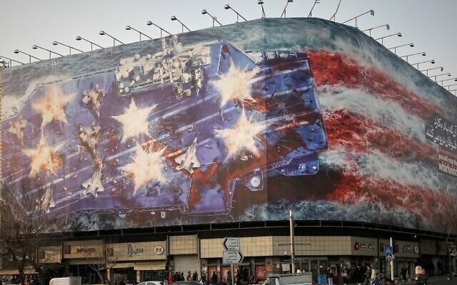 A billboard depicting a damaged US aircraft carrier with disabled fighter jets on its deck and a sign reading in Farsi and English, “If you sow the wind, you’ll reap the whirlwind,” at Enghelab Square in Tehran, Iran, January 25, 2026. (AP Photo/Vahid Salemi)