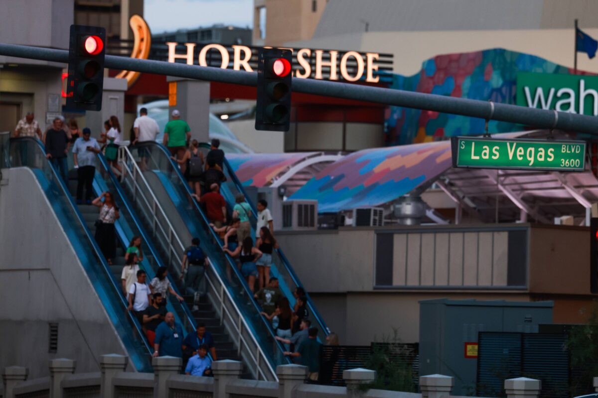Las Vegas Strip visitors ride the escalator near the retail plaza in front of the Horseshoe Las Vegas on June 9, 2025. (Jeff Scheid/The Nevada Independent)