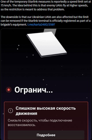 After negotiations with SpaceX, SpaceX has limited the speed at which Starlink terminals are allowed to operate, which restricts their use on drones. This speed limit can be lifted when the terminals are authorized and registered as part of a brigade’s official equipment.