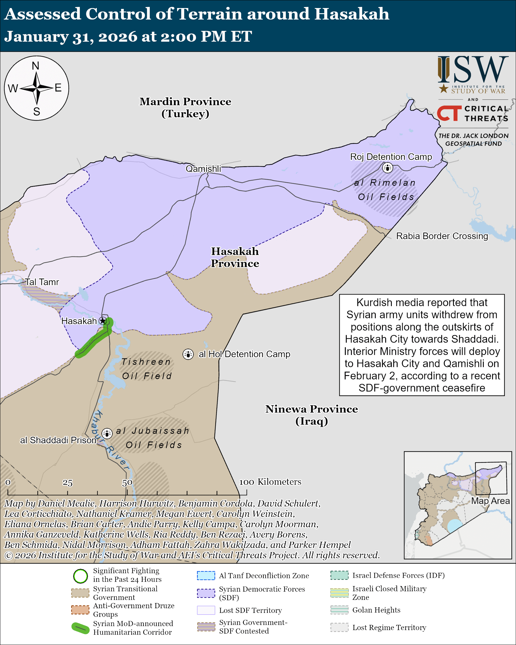 Note: CTP-ISW will publish updates on January 31 and February 1, providing analysis about developments in Iran and Syria. We will resume full coverage on Monday, February 2.