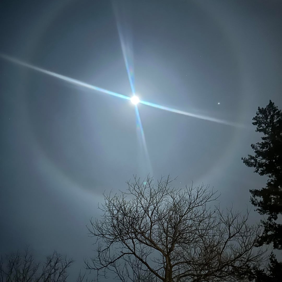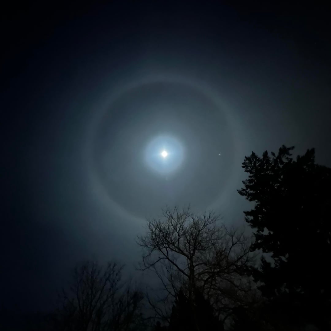 10. Moonring! It’s a halo formed around the moon (and sun as well!) by atmospheric ice crystals. They tend to show up when it’s bitterly cold out and there’s wispy cirrus clouds. If you see two bright spots at the 3:00 and 9:00 positions, those are called moondogs or paraselenae.