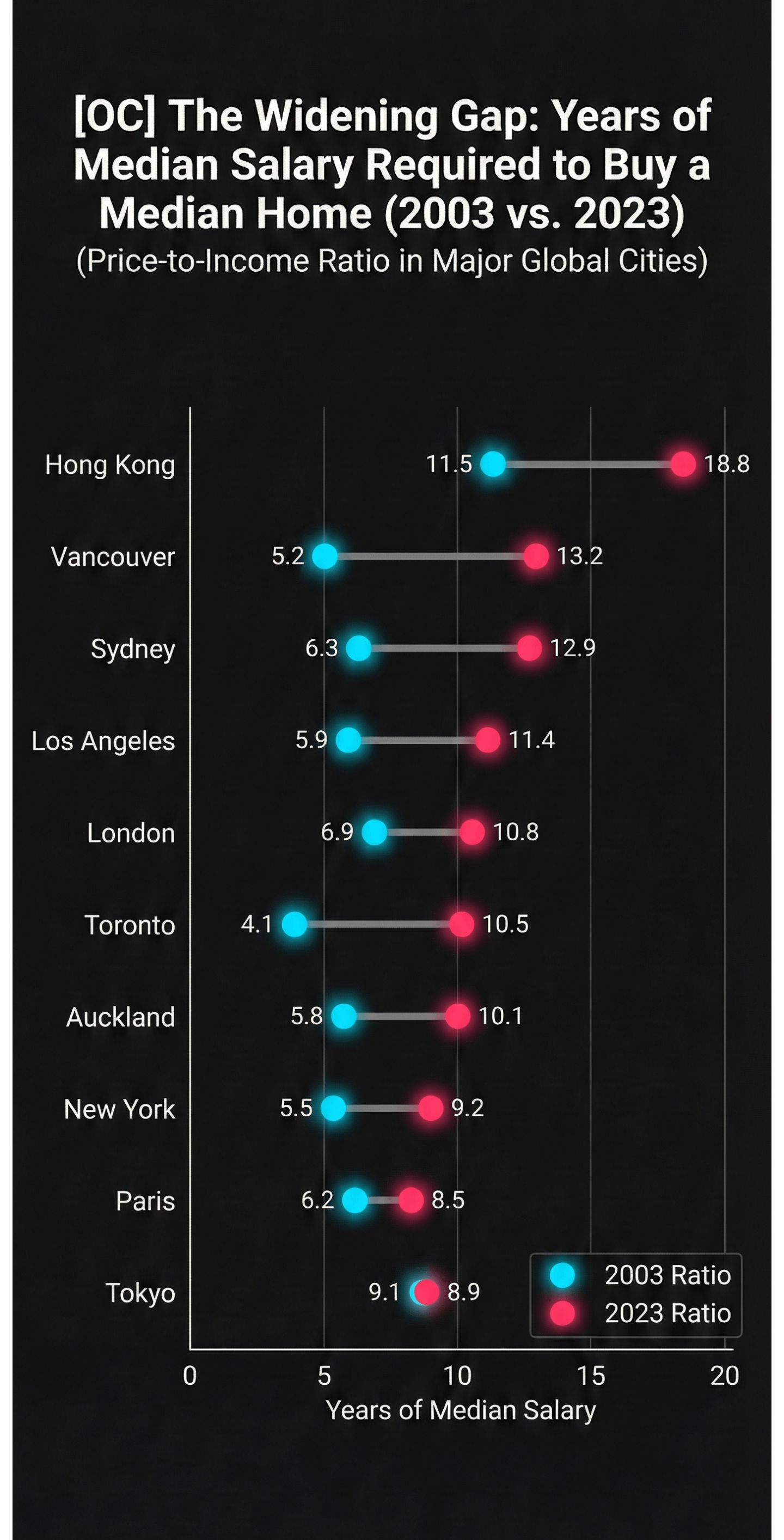 Shouldn’t Tokyo have the colours switched? As the data shows that in 2003 you needed a bit more than 2023, thus going the other way than other cities?
