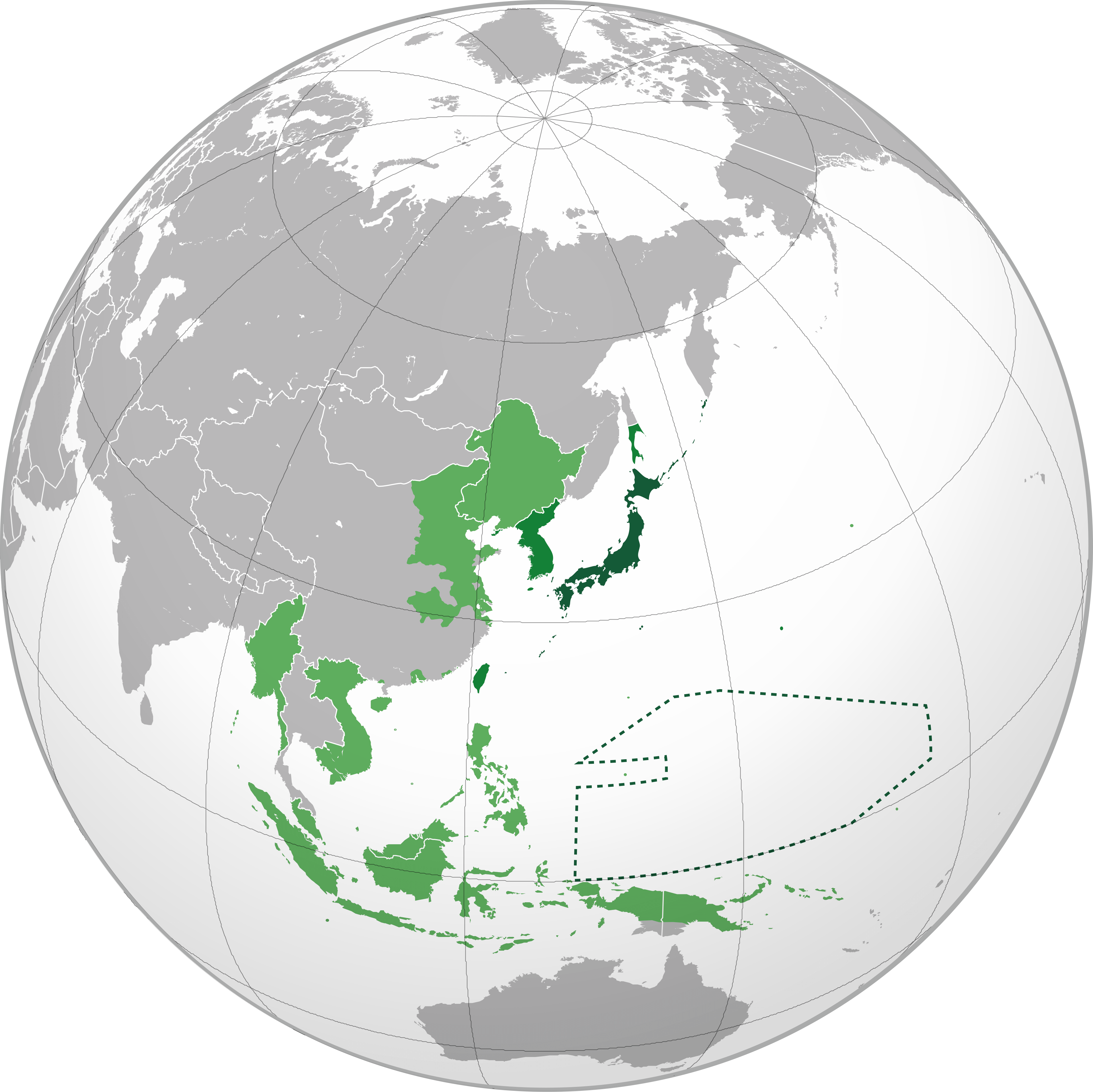 - Dark green denotes the Japanese home islands and South Seas mandate;