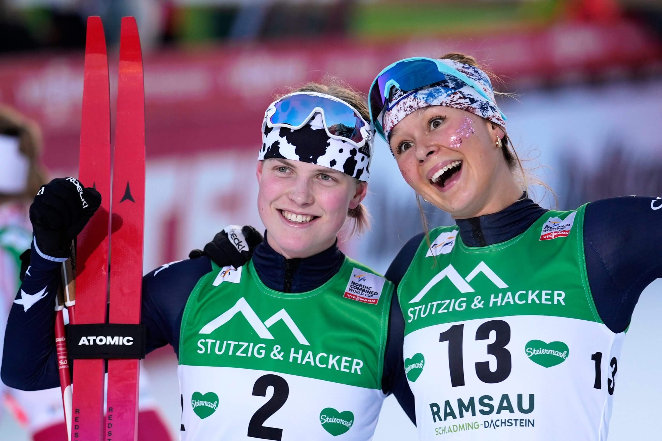 Alexa Brabec (left) and Annika Malacinski at December’s Nordic Combined World Cup in Austria. (AP Photo / Matthias Schrader)