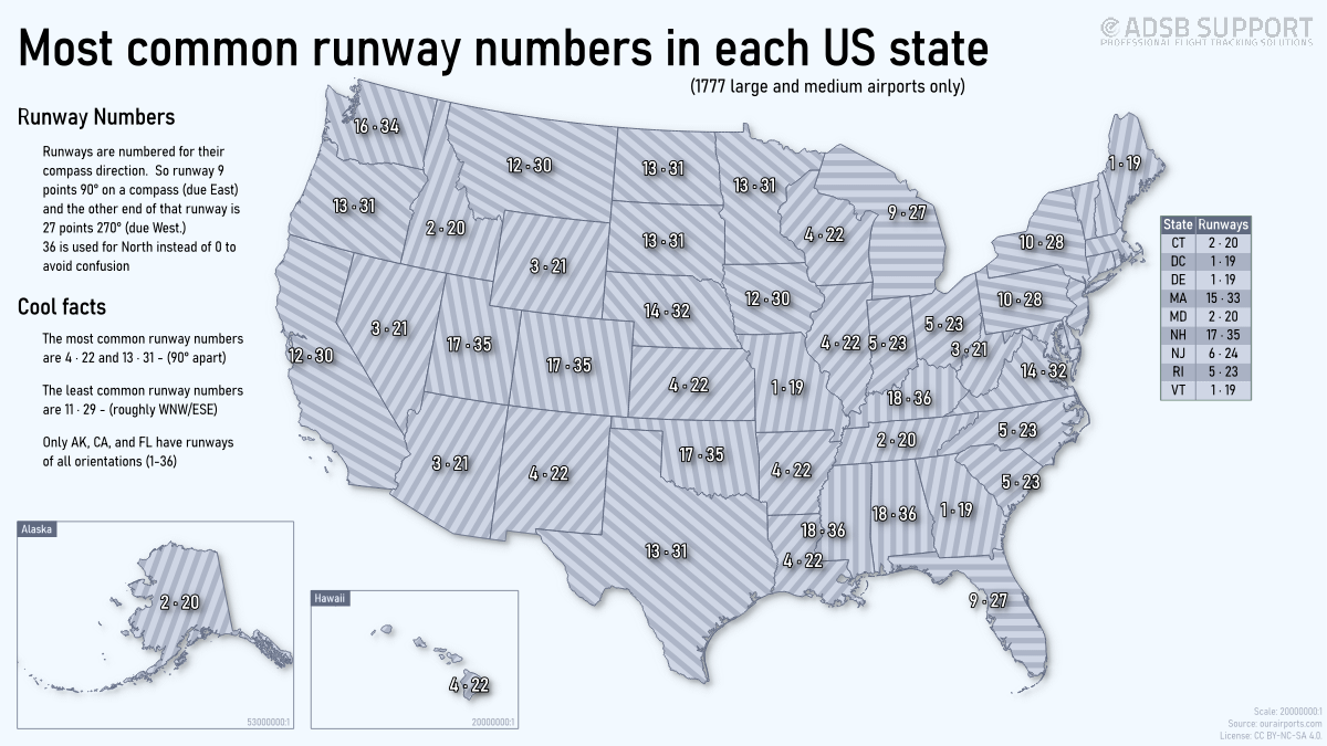 Pretty fascinating map, should correlate nicely to prevailing wind directions. Important note that the further away from the equator, the greater deviance in geographic and magnetic direction, so a 9-27 runway won’t be exactly east west in the northern US