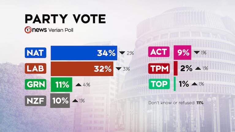 ACT appear to be the casualty of New Zealand First’s increase, falling by 1% down to 9%.