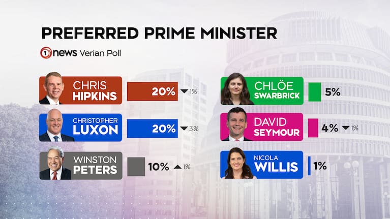 Both leaders sit on 20% in today’s 1News Verian poll, with Luxon taking a 3% drop and Hipkins a 1% drop.