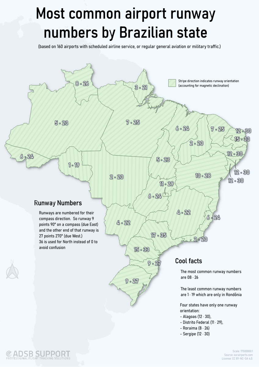 This is the second visualization of this type I've done, that this time looks at all the major airport runways in Brazil, and shows the most common orientation in each state.