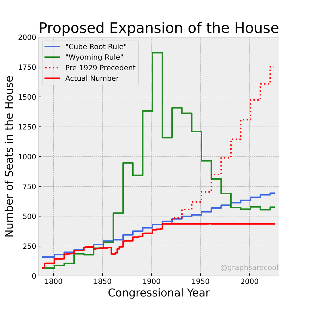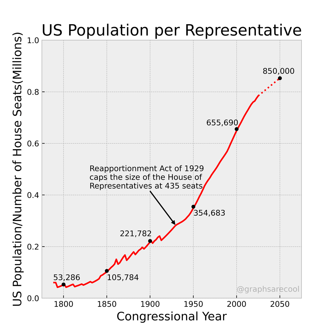 This is genuinely one of the bigger reasons we are where we are. A cap on the house with a growing population and a minimum of 1 seat per state means a consistent tilting of voting power toward those in lower population states, making federal laws represent an ever decreasing portion of the population