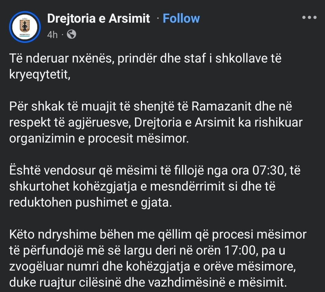 Un personalisht nuk agjeroj, as kurr nuk kom agjeru, po e respektoj shumicen qe agjeron, edhe nuk shoh problem. Cka ka lidhje qe u shty pak orari e nxansave, ose pse duhet me u kon problem? Ka shume prind qe i marrin fmite e tyne prej shkollave, edhe duhet me ngajt me i bo krejt senet. Bile shume mire qe ja kan nis pak me menu per qytetart.