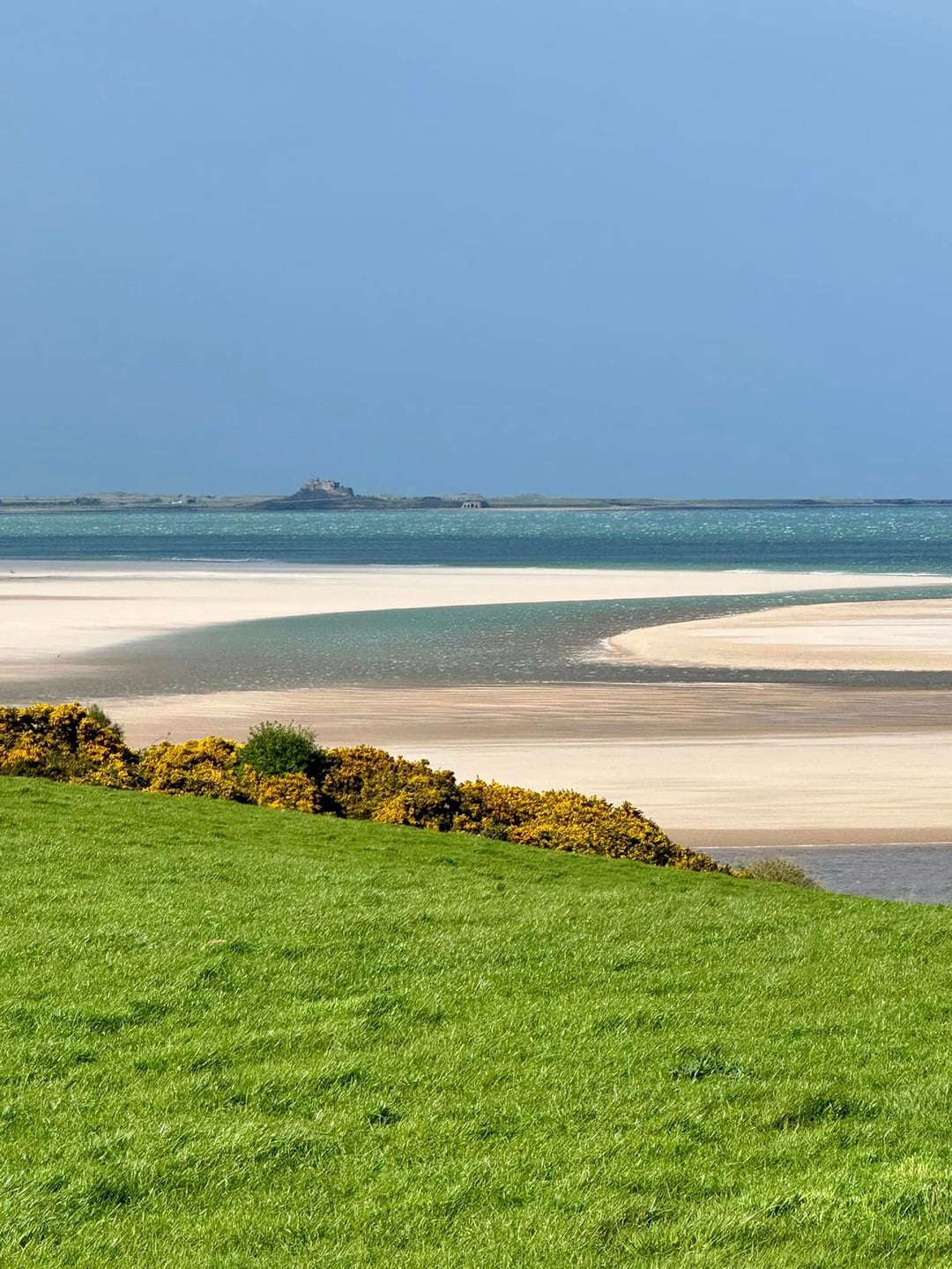 A short drive from Bamburgh brings you to Budle bay, which can be accessed from a couple of paths from the road. At low tide on a sunny day, the colour of the water flowing into the sea displays beautiful colours of green and blue.