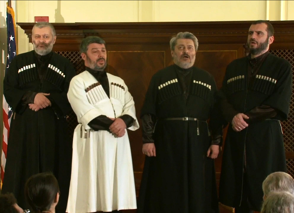The larger choir led by Malkhaz Erkvanidze in 2005 was able to give still more variations on the ancient polyphonic singing styles of Georgia with some more secular examples as well as religious songs. They demonstrated styles of call and response songs and a type of yodeling that is unique to Georgia. The choir members are David Zatiashvili, Koba Beriashvili, Gocha Balavadze, Grigor Bulia, Vasil Tsetskhladze, Zaal Tsereteli, David Shugliashvili, Levan Veshapidze, Mamuka Kiknadze, David Megrelidze, and Gocha Giogadze. A short essay from the handout for this event with more information about the music is available at this link. (This was produced when the Library of Congress was new to making webcasts, so the format is smaller than more recent videos, but it has been remastered and has good picture and sound. Luckily, the acoustics in Madison Hall, which are challenging for most kinds of music, are excellent for choral singing.)