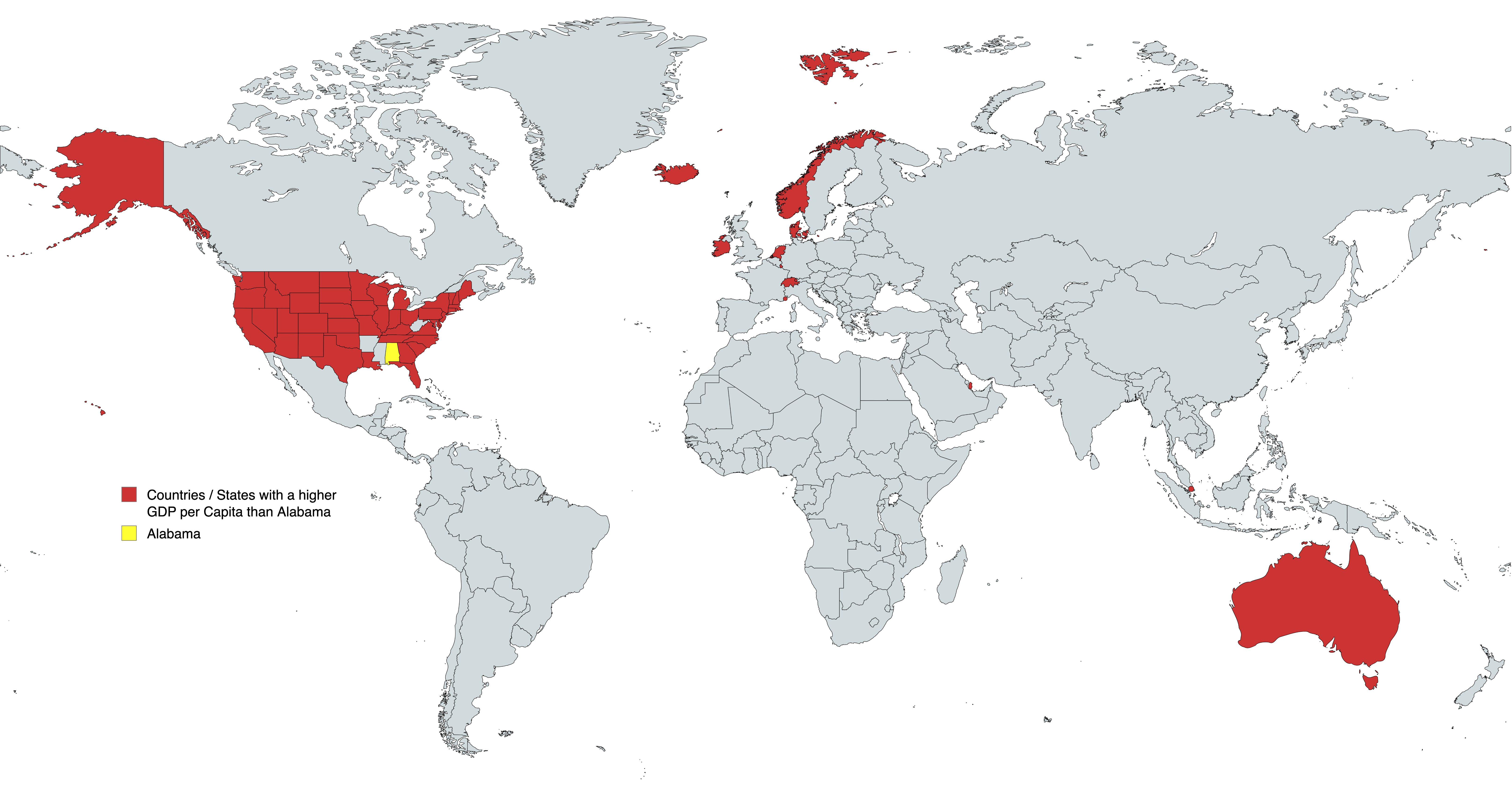 This is indeed important to note within proper context. Alabama indeed generates more wealth than even most western countries. But generating wealth is not the same as median income, nor quality of life. It is a good measure for some aspects of an economy, but an extremely roundabout way to measure prosperity of the people.