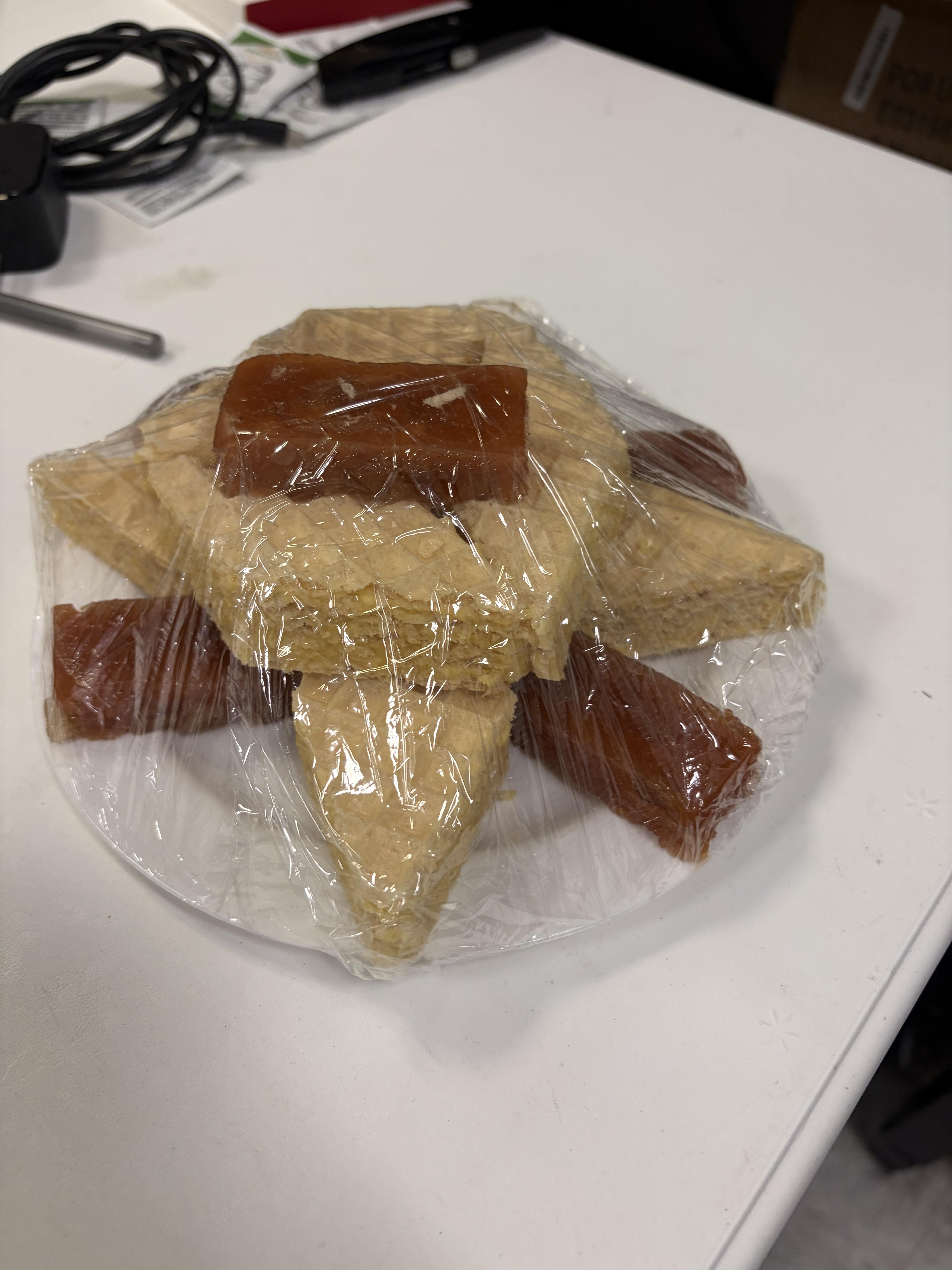 Brown squares are cut fruit. She said that at first but I didn’t realize they were actual fresh fruit. Not sure what kind of fruit still though lol. The wafer thing was very soft and lemon flavored. Very good.