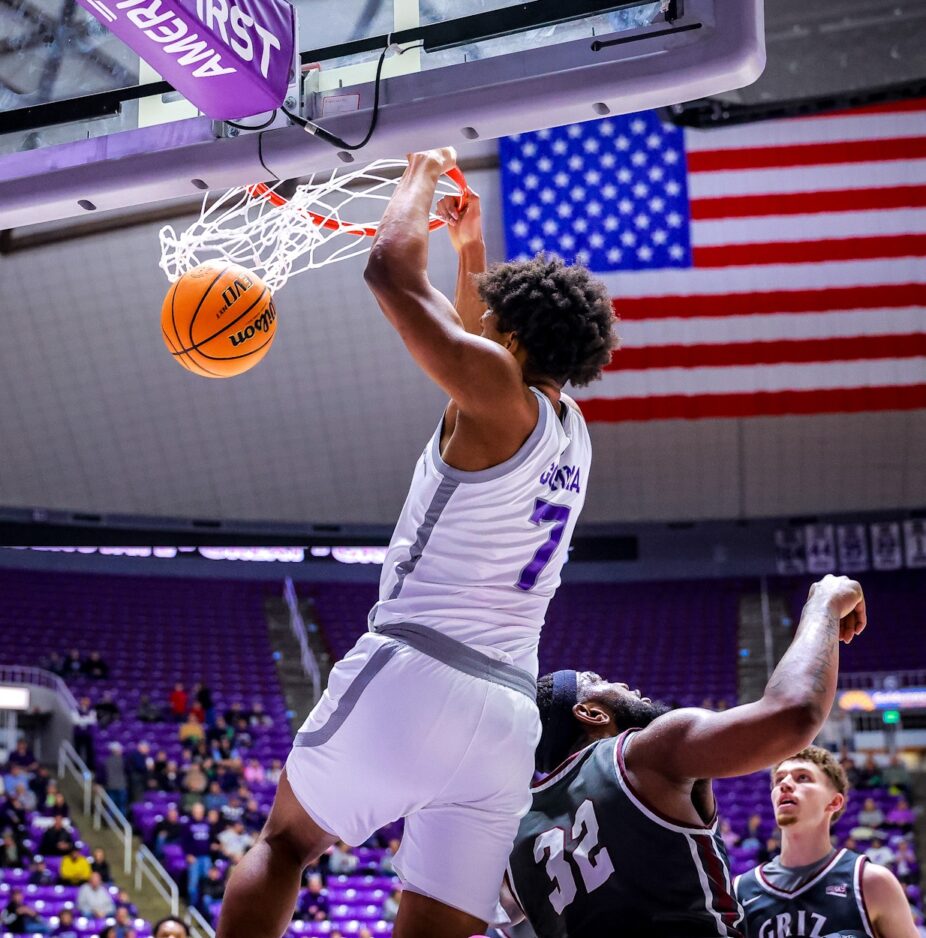 - Weber State center Malek Gomma (7) throws down an alley-oop dunk over Montana’s Te’Jon Sawyer (32) in a Big Sky Conference game Saturday, Feb. 21, 2026, at the Dee Events Center in Ogden.
