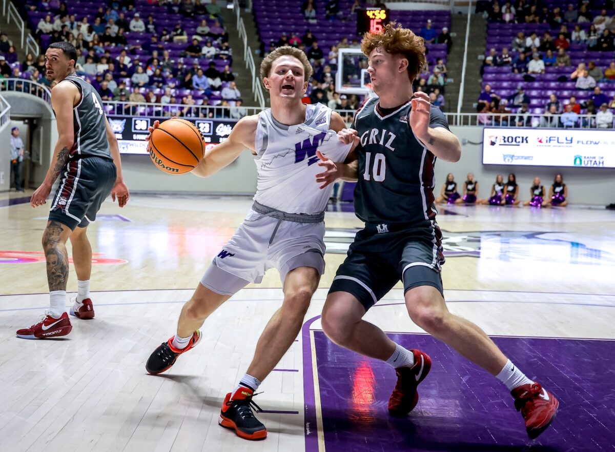 - Weber State guard Trevor Hennig, left, drives while Montana’s Connor Dick (10) pulls his jersey in a Big Sky Conference game Saturday, Feb. 21, 2026, at the Dee Events Center in Ogden.