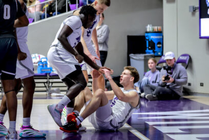 - Weber State players Tijan Saine, left, and Viljami Vartiainen, top, help up teammate Trevor Hennig, right, in a Big Sky Conference game Saturday, Feb. 21, 2026, at the Dee Events Center in Ogden.