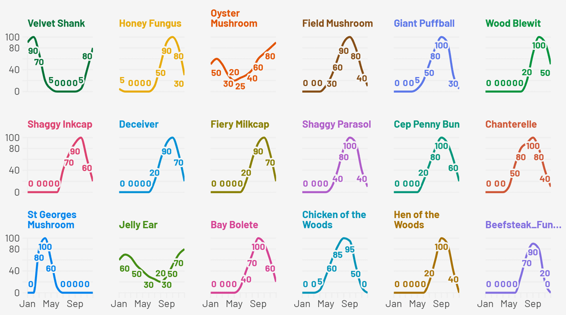 [OC] Seasonality of UK Wild Mushroom Fruiting Peaks (18 Common Species) Posted by Express_Classic_1569