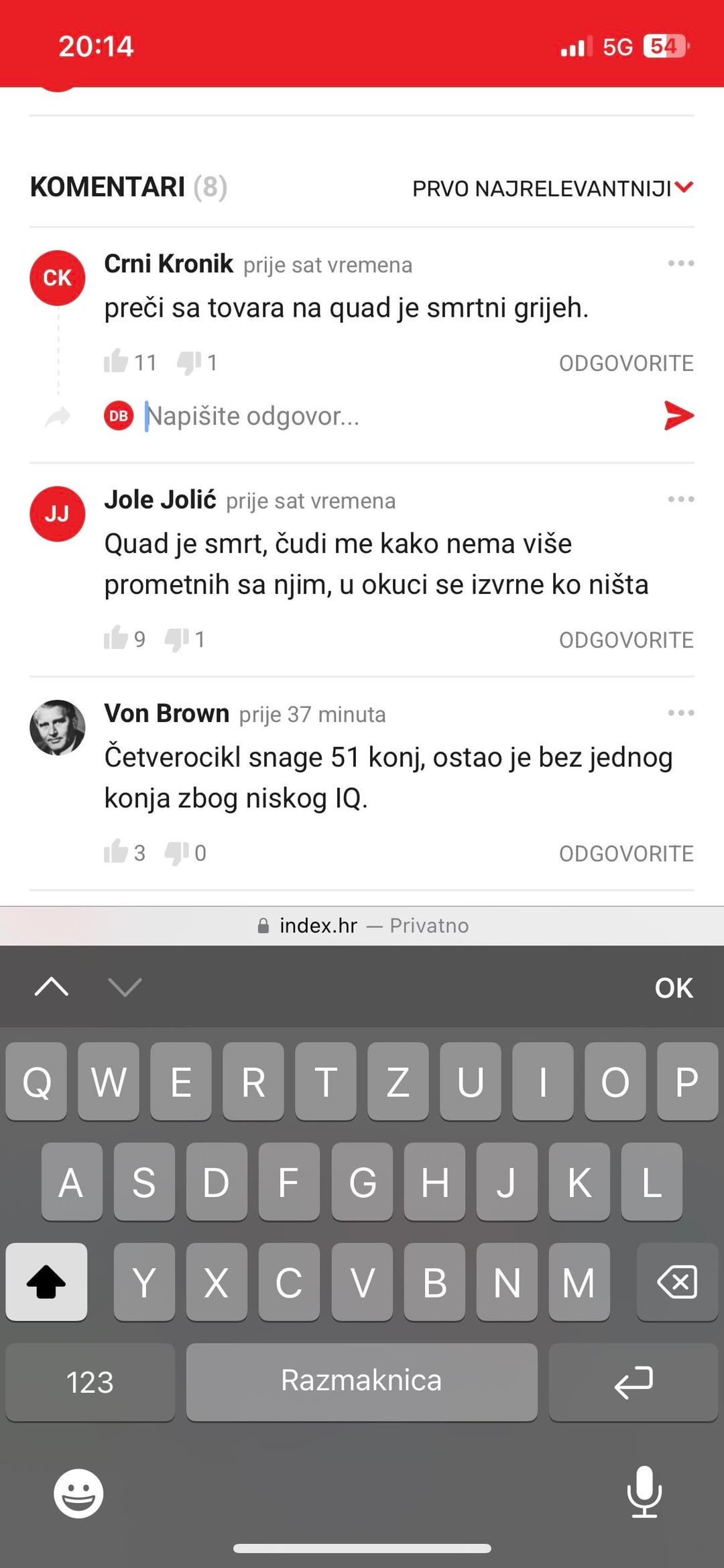 Ograničena nacija koja se ne usudi niti malo izaći iz svog komfora. Vani je hladno i nitko ne izlazi iz kuće jer ćemo valjda svi pocrkati od hladnoće. S druge strane Skandinavci parkiraju bebe vani na hladnoći, puštaju djecu da skaču u blatu kad je kiša, odlaze biciklirati s djecom, a vani pljusak, šeću okolo kad je hladno, daju djecu općenito autonomiju i odgovornost da ne postanu debili za razliku od nas Balkanaca kojima mame, tate, bake i djedovi nedaju da se popnemo na ljestve ili stojimo na kiši 10 sekundi. Ograničena nacija, nacija debila. Zato ovakvi komentari po ljudima koji se usude voziti quad.
