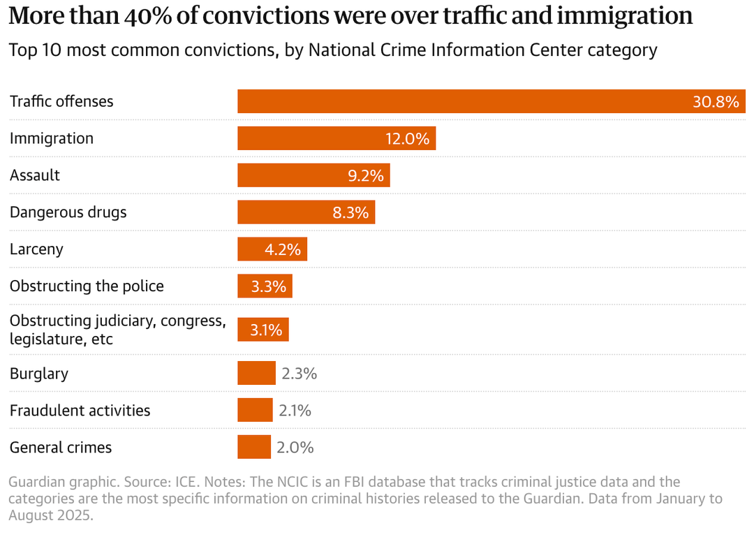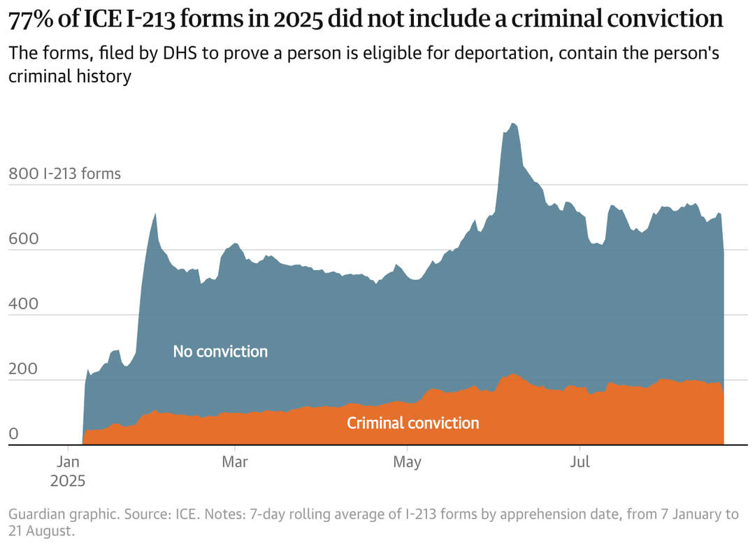 The Guardian analyzed data extracted from nearly 140,000 I-213 forms, from January 2025 through mid-August 2025, and found that the surge in arrests under Trump is driven by the apprehension of people who have never been convicted of a crime.