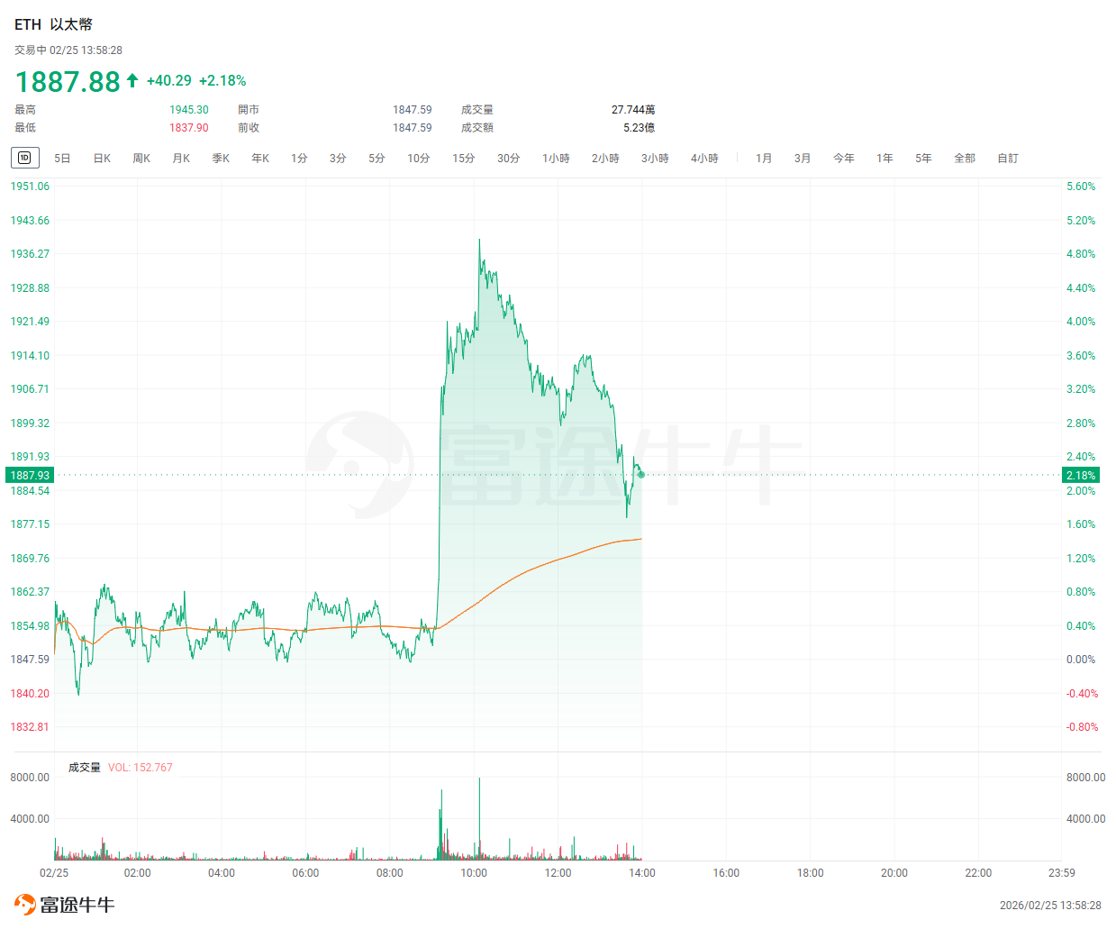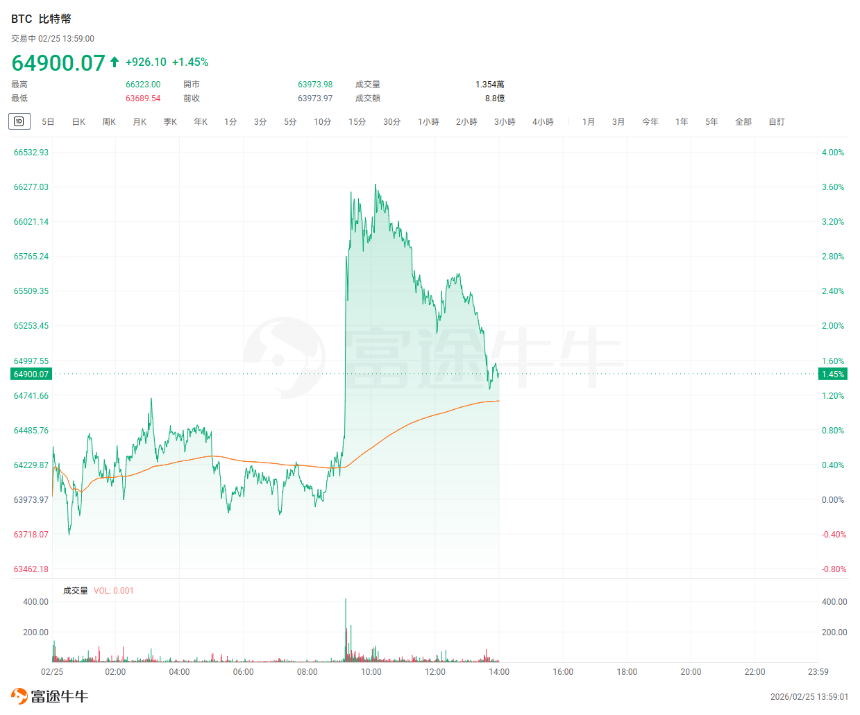 On February 25, reports indicated that the cryptocurrency market has rebounded. As of press time, $Bitcoin (BTC.CC)$ Bitcoin rose by 1.45%, reaching $64,900.07; $Ethereum (ETH.CC)$ Ethereum increased by 2.18%, trading at $1,887.88, with a gain exceeding 3% in the past 24 hours.