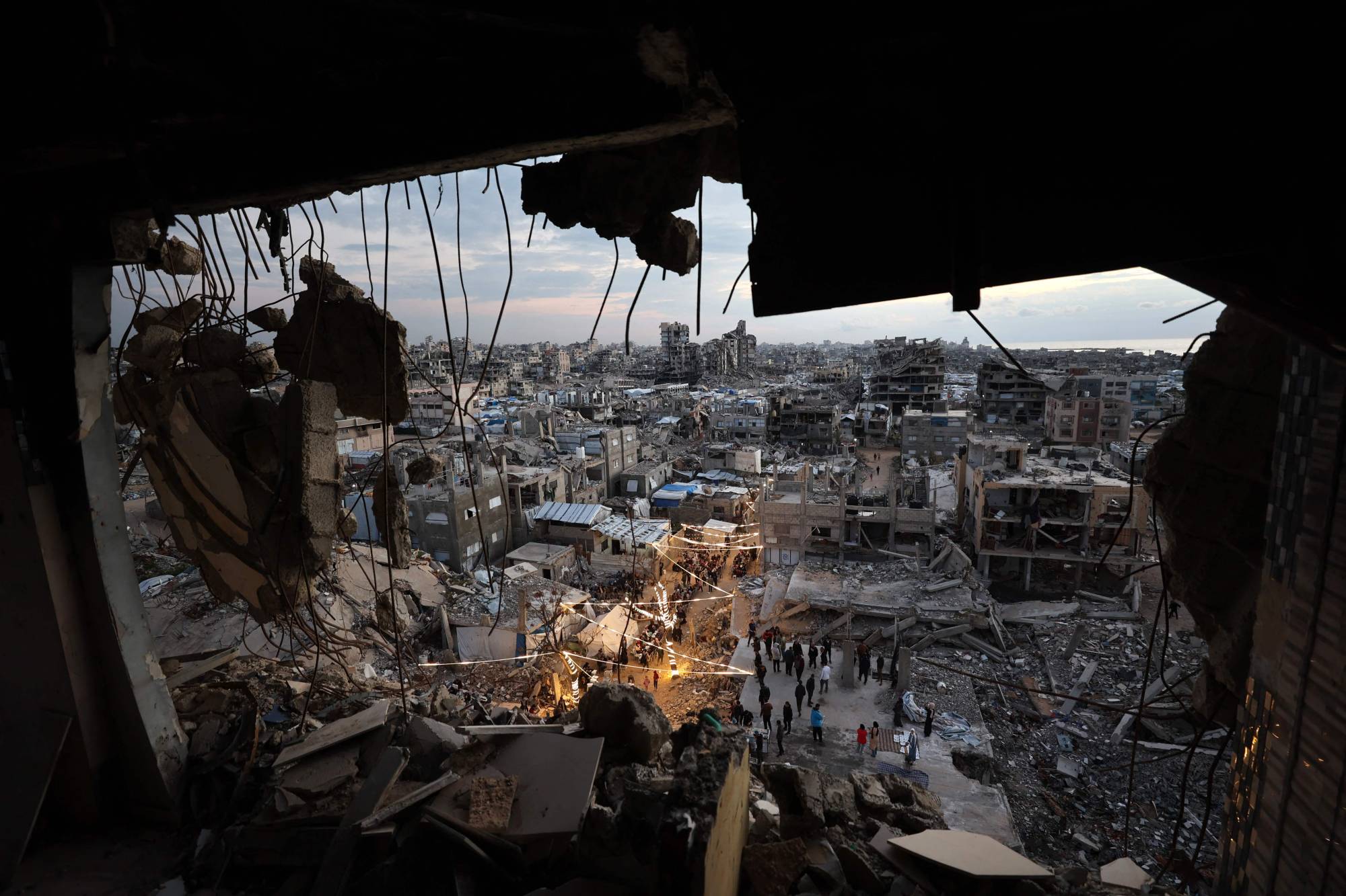 Displaced Palestinians gather for an Iftar meal amid the rubble of destroyed buildings at the Jabalia refugee camp in the northern Gaza Strip, during the Muslim holy fasting month of Ramadan, on February 23, 2026. (Photo by Omar AL-QATTAA / AFP)