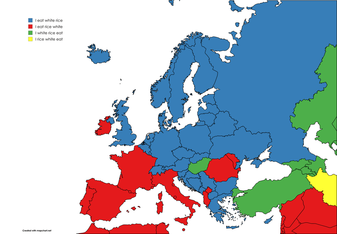 Edit: Wait, no, purple is “Eat I white rice” but Irish would be “Eat I rice white”, its own category.