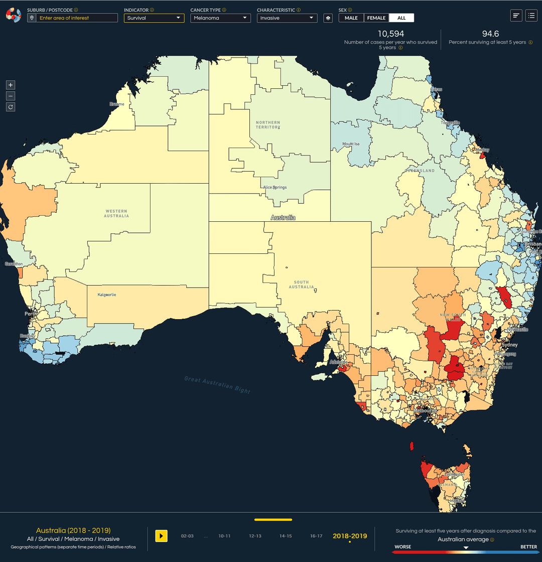I wonder if demographics getting frequent exposure to the sun mainly from a tan, living in warmer weather and/or work outside with very little sun protection actually also has high survival rates thanks from the belief that their frequent sun exposure meant the need to checkup and assess the risk? Whereas I also think lot of those that didn’t survive probably have a higher proportion being individuals that somehow got diagnosed despite have less sun exposure meaning probably not related the sun. This might explain the higher survival rates in Queensland compared to Victoria.