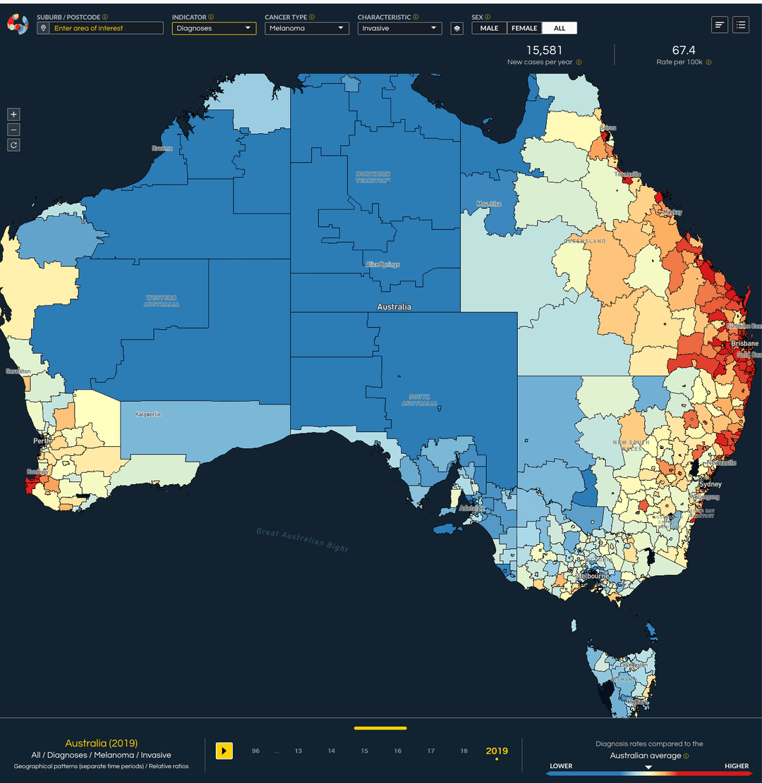 UV is higher in northern NSW and QLD, combine this with cities being population hotspots and regional hubs having access to fewer medical services. While visually interesting this doesn’t actually provide any novel insights. Per 100k population scaling might not be as effective as you’d like because it reinforces the population hotspot bias.