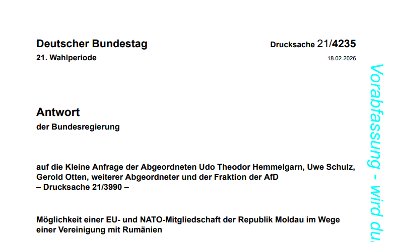 In response to the question “does the federal government directly or indirectly (e.g. through the German Society for International Cooperation – GIZ) support non-governmental organizations in the Republic of Moldova that are in favor of unification with Romania or actively promote it?”, the cabinet replied that “the federal government does not support projects in the sense of the question posed”.
