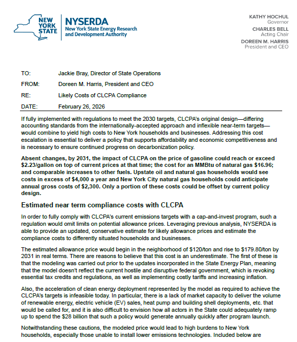 This morning a document from the NYS Energy Research and Development Authority sent to State Operations Manager Jackie Bray titled, “Likely Costs of CLCPA Compliance.” The report detailed that prices will increase through 2031 creating “high burdens” for households and businesses unless the plan in place now is modified.