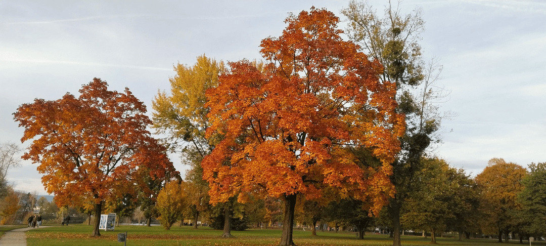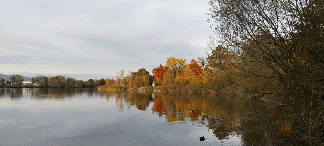 A quiet walk around a lake near Linz, Austria, capturing the vibrant red, orange, and yellow colors of the trees reflected in the water.