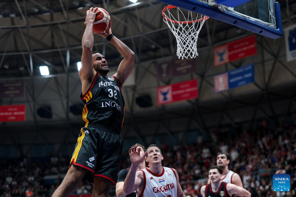 Johannes Thiemann (top) of Germany dunks during the first round group E match between Croatia and Germany at the FIBA Basketball World Cup 2027 European Qualifiers in Zagreb, Croatia, on Feb. 27, 2026. (Igor Kralj/PIXSELL via Xinhua)
