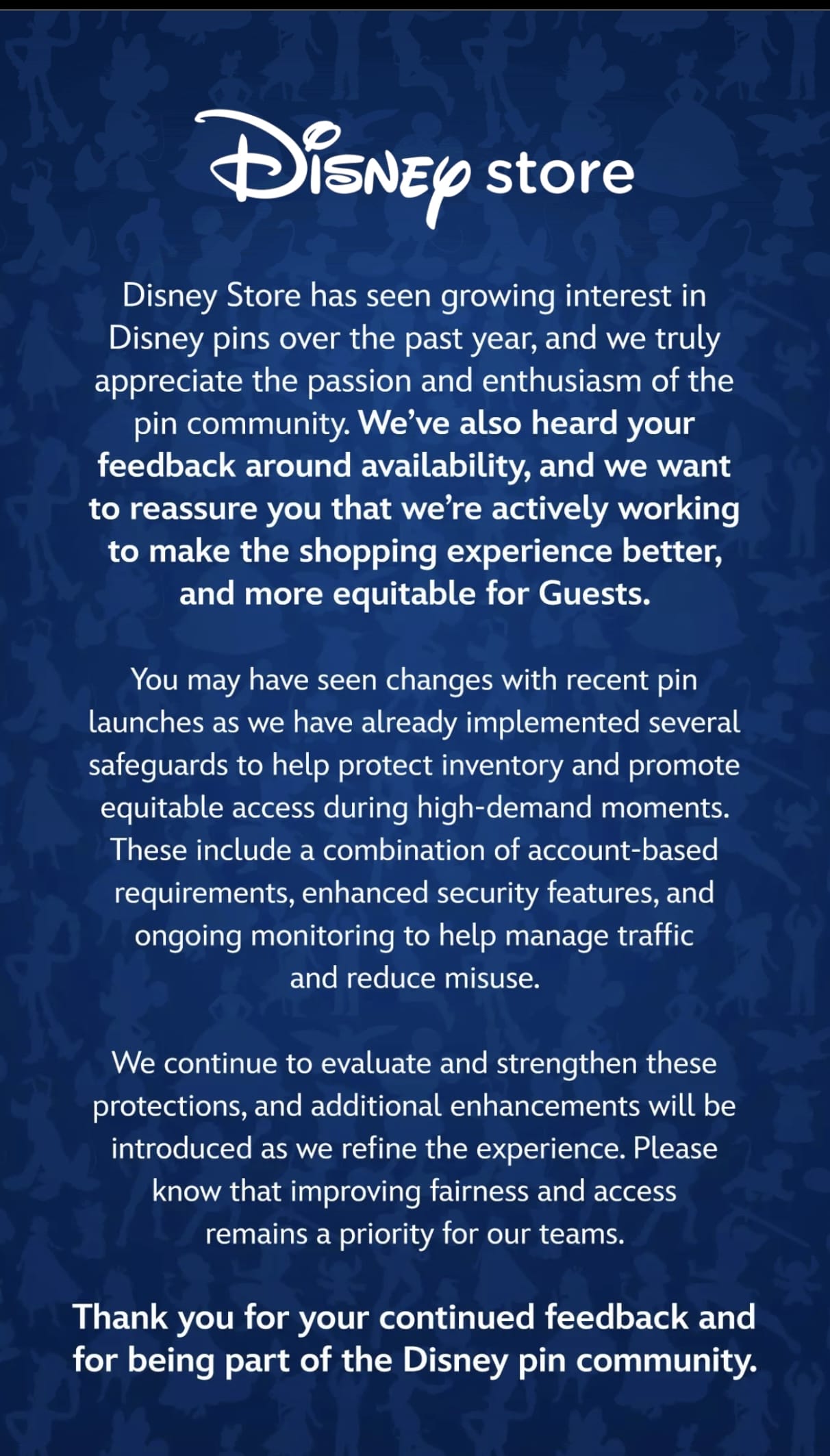 Disney Store has seen growing interest in Disney pins over the past year, and we truly appreciate the passion and enthusiasm of the pin community. We’ve also heard your feedback around availability, and we want to reassure you that we’re actively working to make the shopping experience better, and more equitable for Guests.