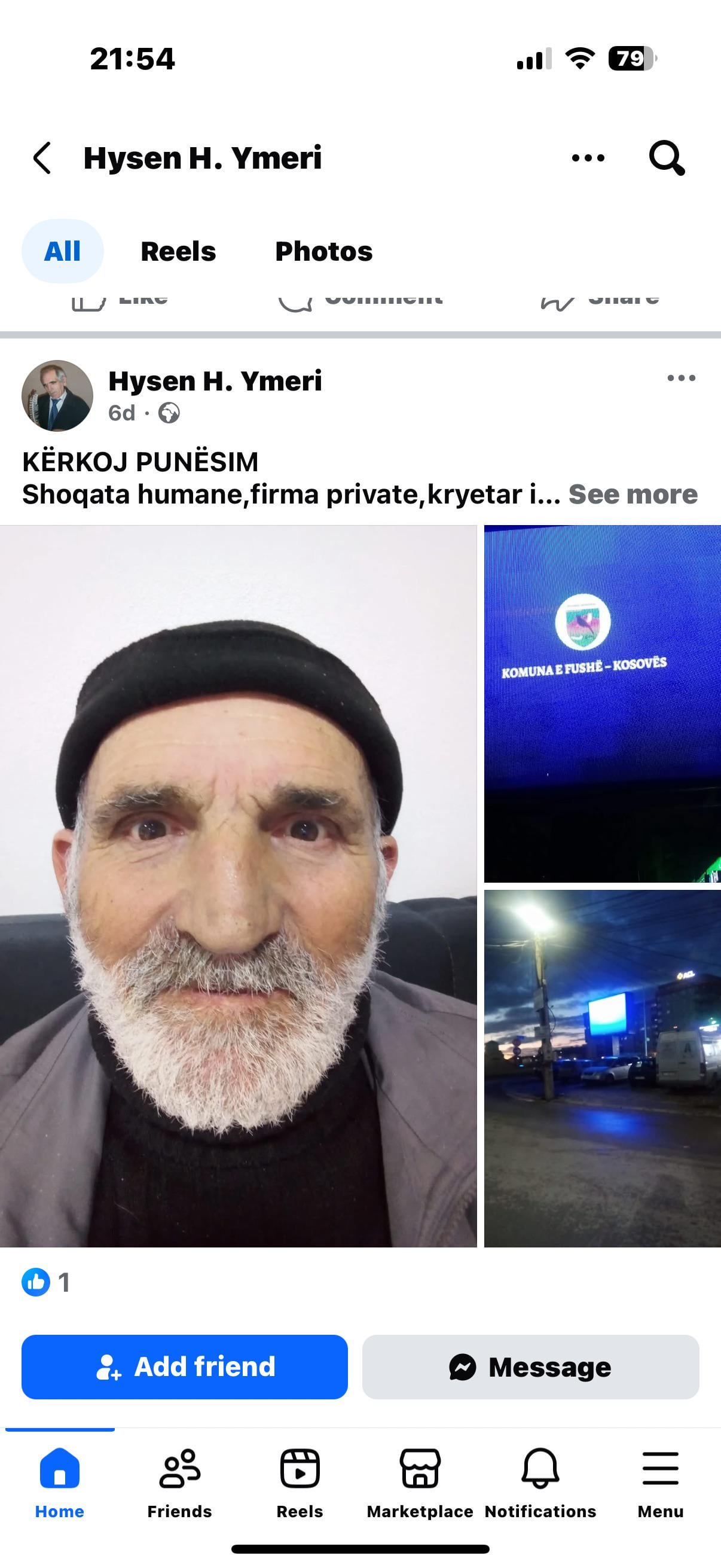 I happened to see this father on fb, he was from Fushkosova, a poet and poor, and his pension money was being spent on electricity/water payments, I said if there is a kind hearted person in Fushkosova, help me a little, even for food or find me a job.