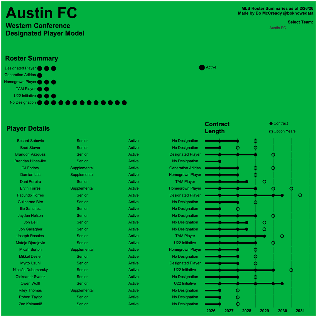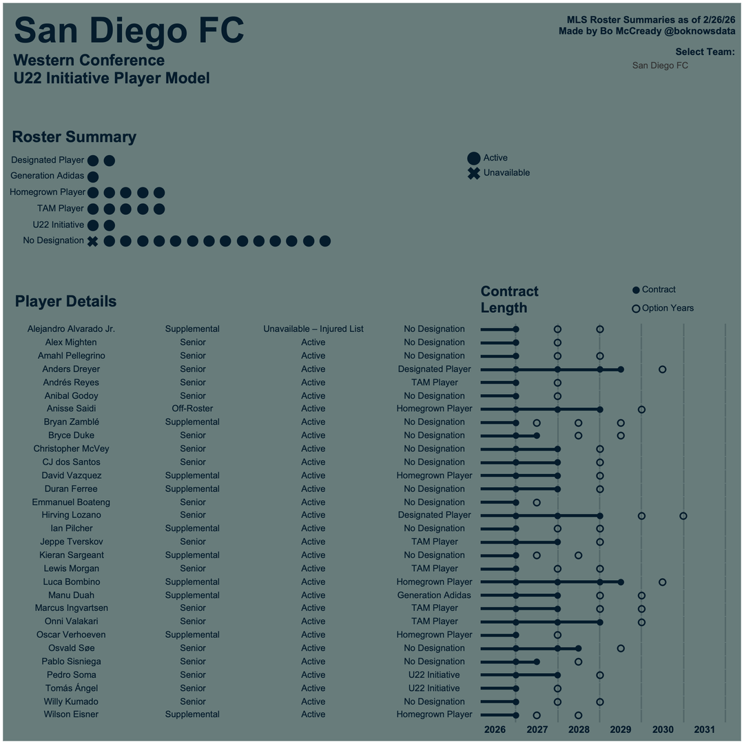 Every season, Major League Soccer releases team rosters at the beginning of the season. These rosters come in .pdf form and I always have trouble noticing any trends. So, I built interactive dashboards summarizing each team's roster breakdown with some visual enhancements and contract timelines.