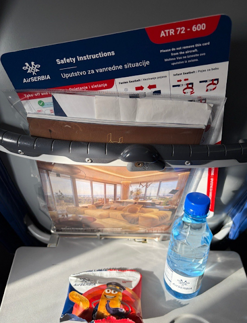 The flight departed three minutes behind schedule but made up time en route. The total flight time came to 1 hour and 6 minutes, with the aircraft touching down in Belgrade six minutes ahead of schedule. Shortly after takeoff, the two-member cabin crew distributed complimentary bottles of water and cookies. Later in the flight, buy-on-board products were offered, although there appeared to be little interest among passengers on this sector.