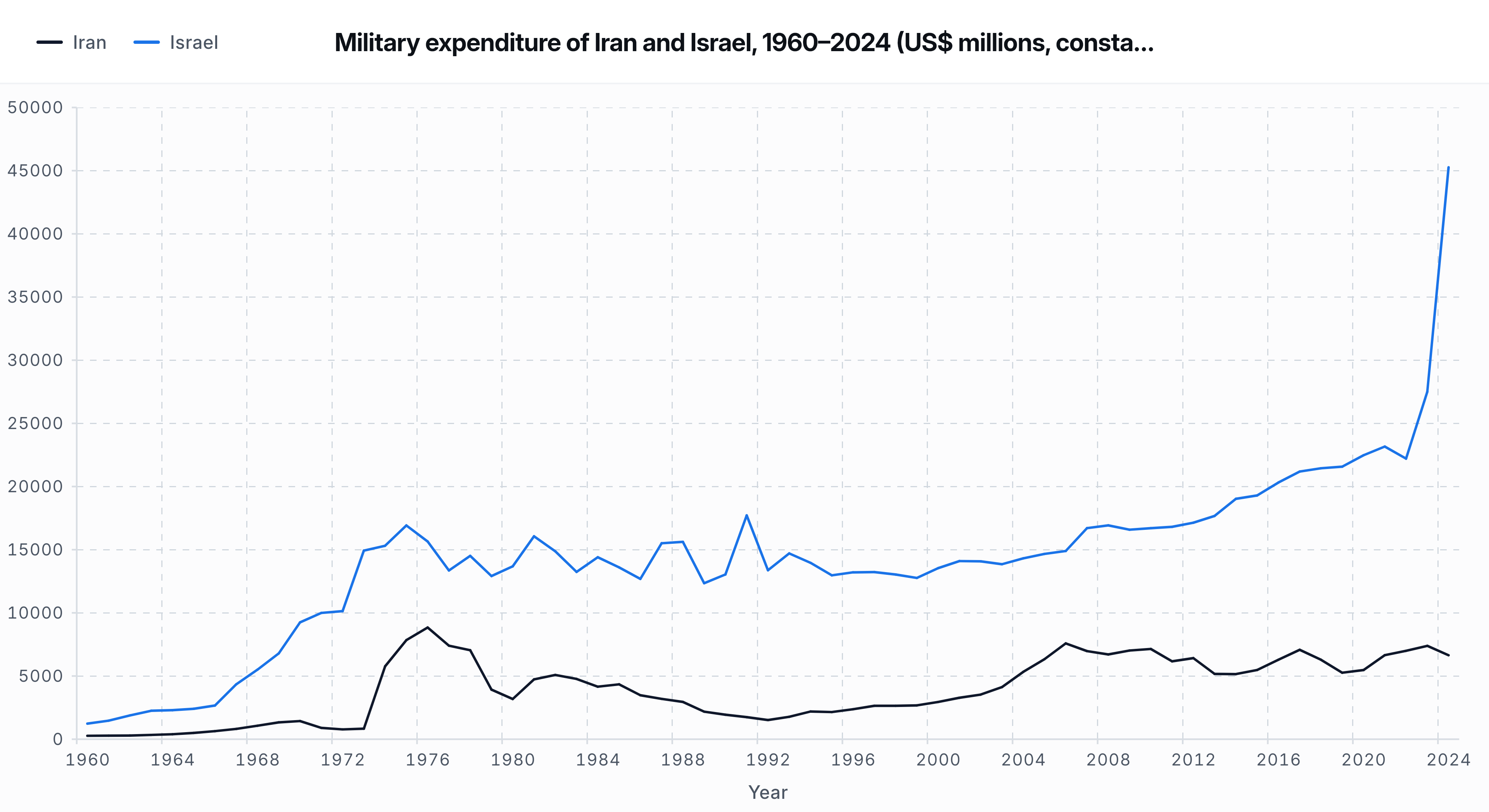 I visualized military expenditure trends for Iran and Israel from 1960 to 2024 using SIPRI’s 2024 database release.