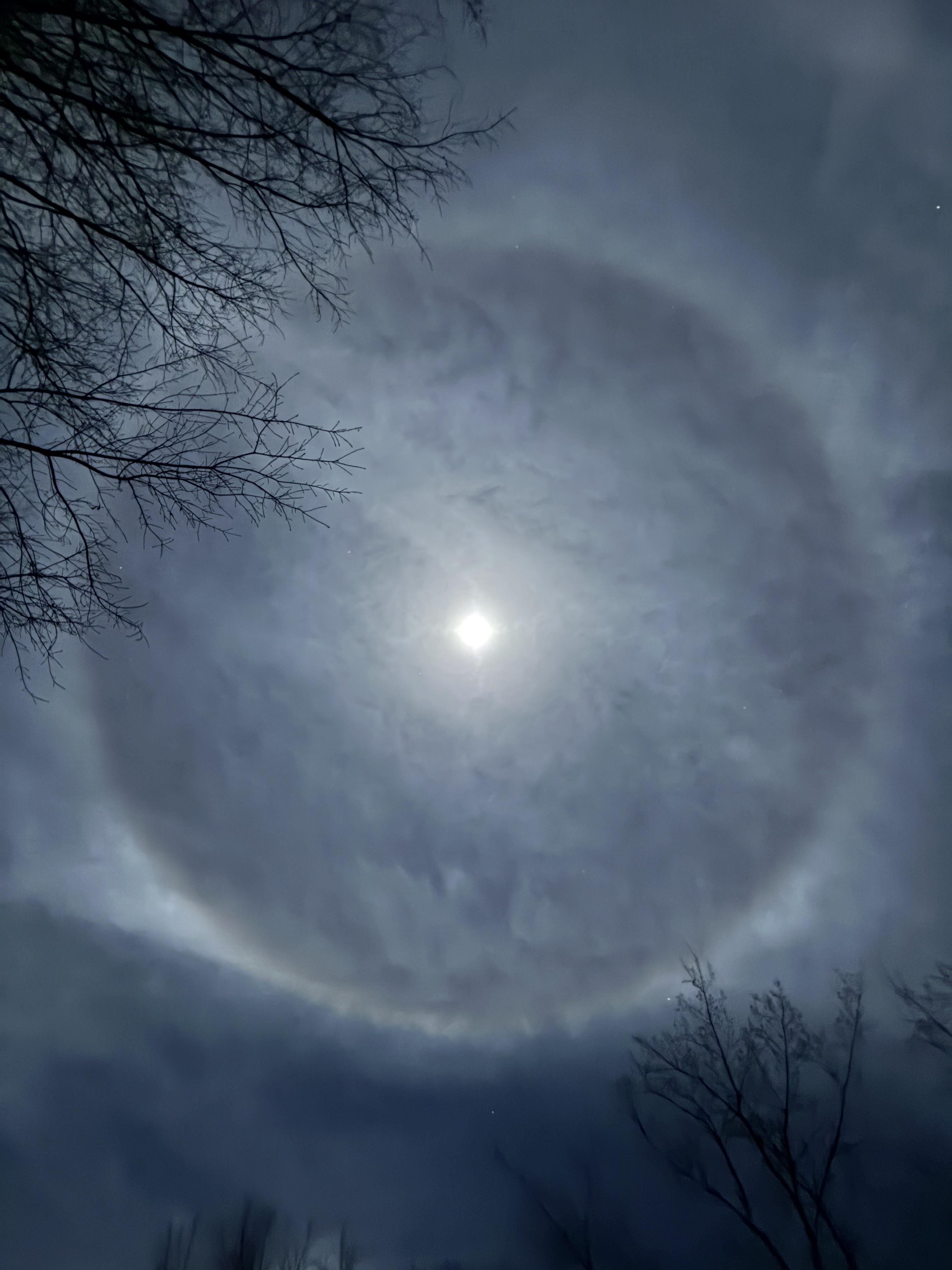2. It’s a “lunar halo” and is a result of moonlight refracting through high-altitude cirrostratus clouds that contain hexagonal ice crystals. They bend the light at a 22-degree angle which creates a circle.