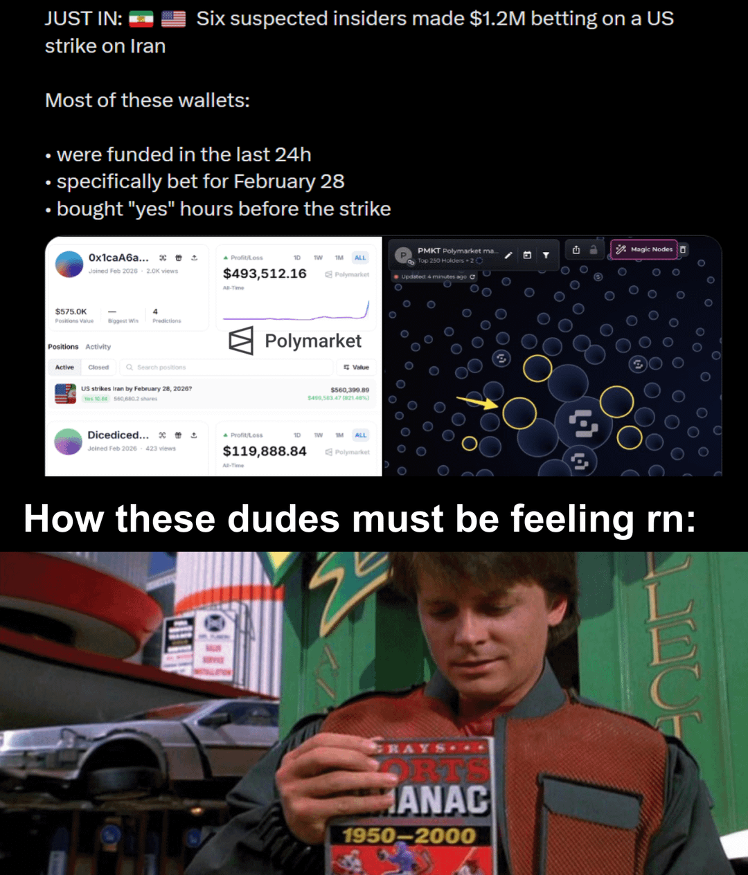 Yeah how is this fair. this is just whales getting richer off this war just because they know some people. theyre colluding and gambling into profits; is this even a prediction market? its more like a money laudering scam