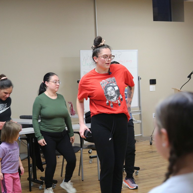 Emma Carufel demonstrates a side step for participants at the Milwaukee Indian Health Center. (Photo courtesy of Gerald L. Ignace Indian Health Center).