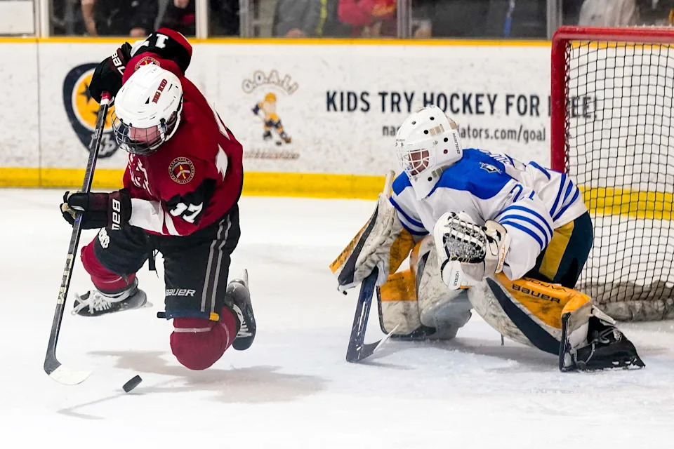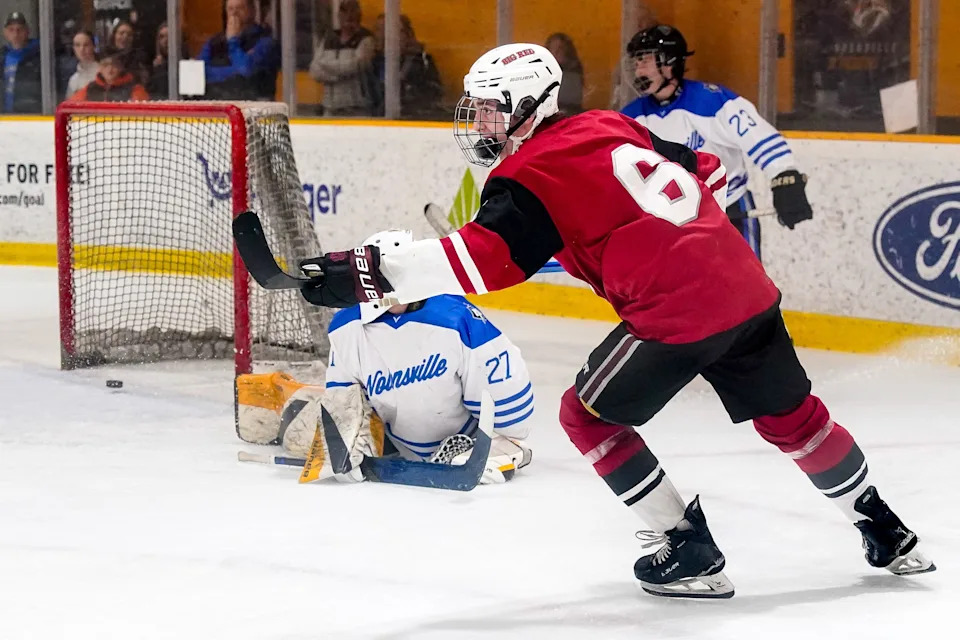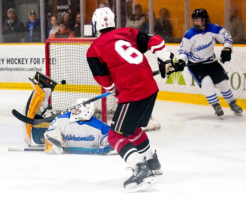 MBA’s Conner Mazzoni (6) scores a goal past Nolensville’s Bingston Soundara (27) during the third period of a GNASH Predators Cup high school hockey championship game at the Ford Ice Center Bellevue in Nashville, Tenn., Monday, March 2, 2026.