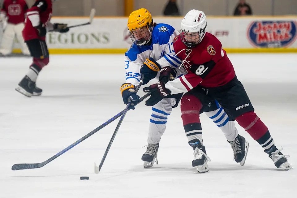Nolensville’s Judah Campbell (13) battles MBA’s Duke D’Alba (88) during the first period of a GNASH Predators Cup high school hockey championship game at the Ford Ice Center Bellevue in Nashville, Tenn., Monday, March 2, 2026.