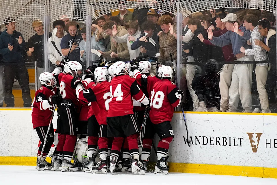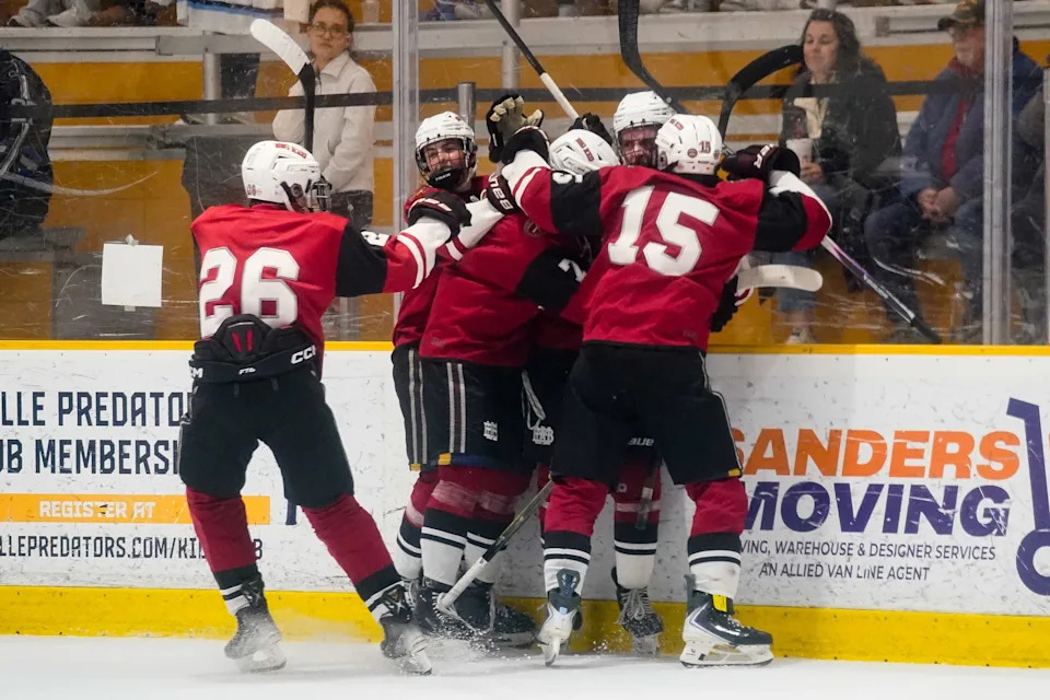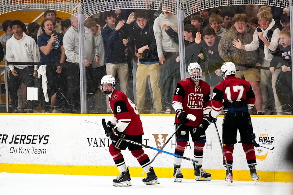 MBA’s Conner Mazzoni, second from right, celebrates his goal against Nolensville with his teammates during the first period of a GNASH Predators Cup high school hockey championship game at the Ford Ice Center Bellevue in Nashville, Tenn., Monday, March 2, 2026.