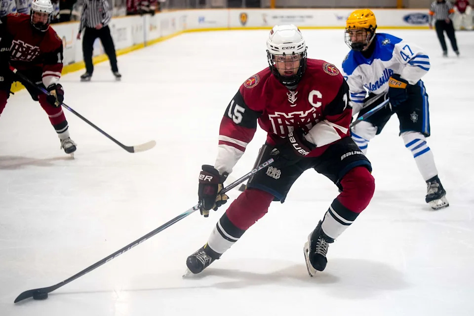 MBA’s Matthew Moore (15) skates with the puck against Nolensville during the first period of a GNASH Predators Cup high school hockey championship game at the Ford Ice Center Bellevue in Nashville, Tenn., Monday, March 2, 2026.